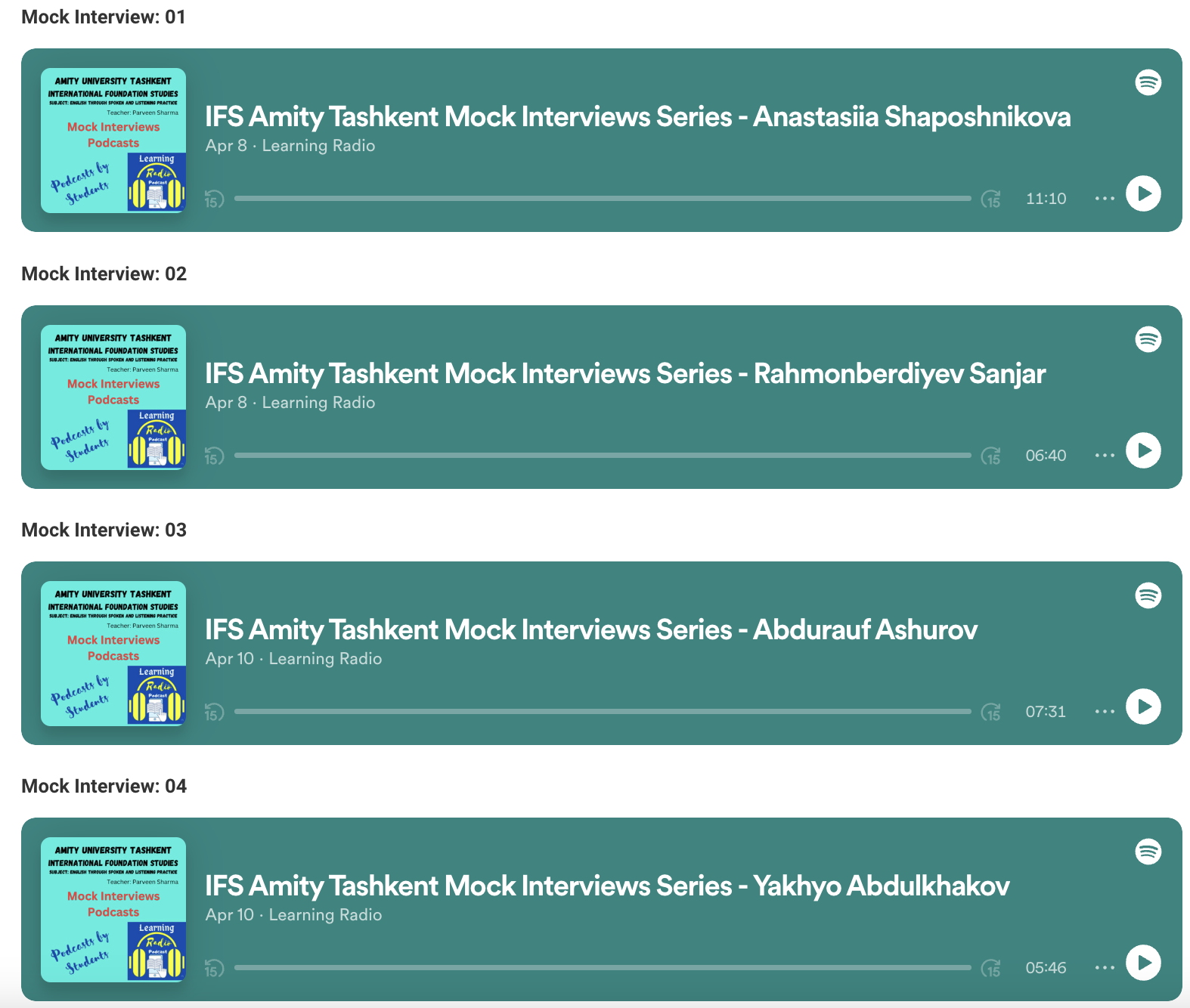 The MOCK INTERVIEWS deserve a dedicated share, so the episodes are embedded from Spotify. You can avoid Spotify, if desired and be on Hubhopper, Apple or even Amazon. A small web search can take you to any site having 'Learning Radio Amity University in Tashkent IFS Podcasts'.